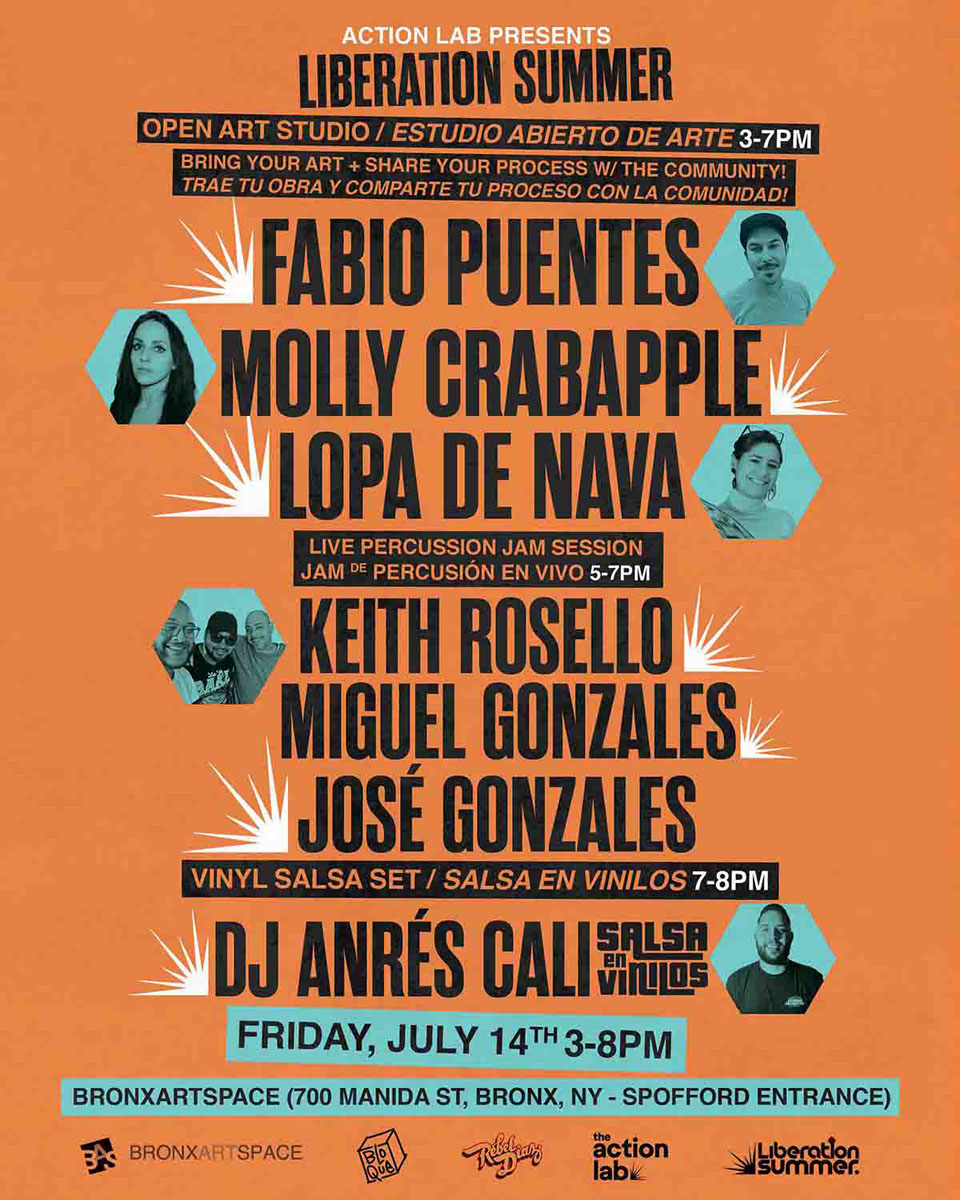Join us for our Open Art Studio event with Fabio Puentes and Lope de Nava, showcasing their creative process in real time. The evening will feature a live percussion jam session with Keith Rosello, Miguel Gonzales, and Jose Gonzales, energizing the atmosphere with rhythmic beats. DJ Andres Cali will cap the night with a Salsa en Vinilos set, spinning classic salsa tracks on vinyl. This event is a part of our Liberation Summer series, celebrating and commemorating the 50 years of hip-hop and the anniversary of the military coup in Chile.