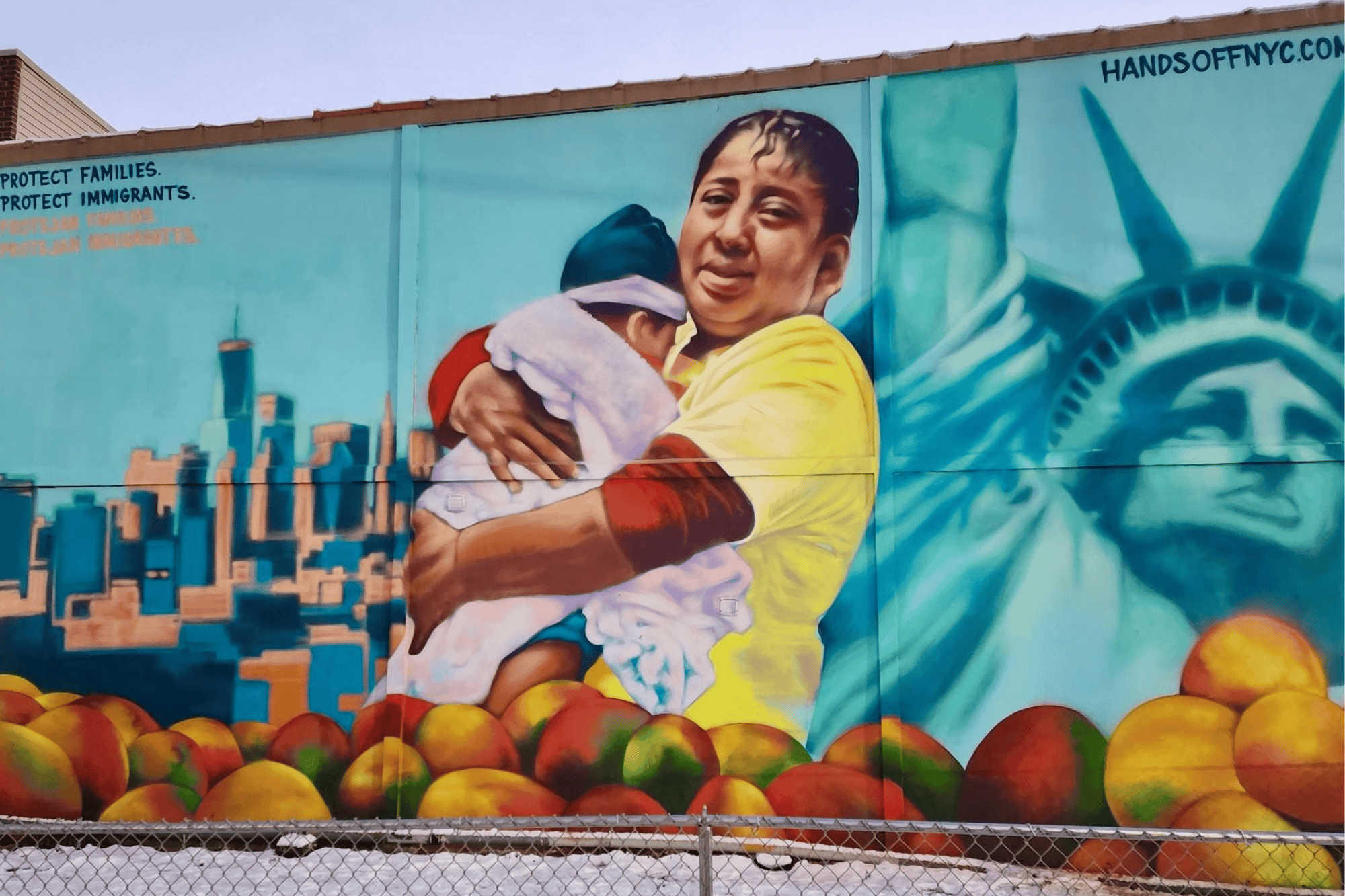 Towering over the corner of Gates Avenue and Irving Avenue, the mural centers dignity, resilience, and future generations. Inspired by the street vendors, the mural features a woman vendor centered in resilience, dignity, alongside a child representing the generations to come. Bilingual text reading “Protect Families. Protect Immigrants.” anchors the piece, alongside visual elements as a nod to the powerful work of the Hands Off NYC coalition and the meaning of the Statue of Liberty and its enduring promise to immigrant New Yorkers.